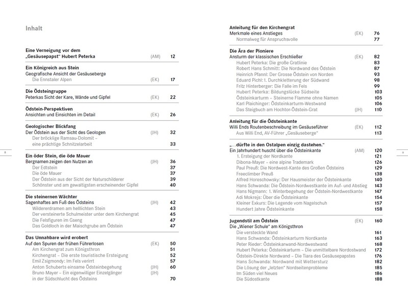Geografische Aspekte, geologische Besonderheiten und so manch „Sagenhaftes“ leiten hernach zur detailreichen Besteigungschronik über: in chronologisch gegliederten Kapiteln findet eine kurzweilige Darstellung der bergsteigerischen Entwicklung statt, die mit der Erstbegehung des Kirchengrates im Jahre1850 beginnt und mit Beiträgen der Bergführer Klaus Hoi und Jürgen Reinmüller bis in die Gegenwart führt.