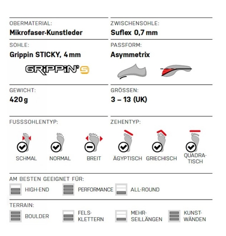 Ein Asymmetrischer Leisten mit gummierter Zehenbox fu¨r toe hooks. Bequemes und schnelles An- und Ausziehen garantiert die Slipper-Konstruktion mit einem Velcro-Verschluss. Eine sensible und pointierte Spitze und eine speziell fu¨r heel hooks konstruierte Ferse machen diesen Schuh zur idealen sensiblen Waffe fu¨r das Bouldern.